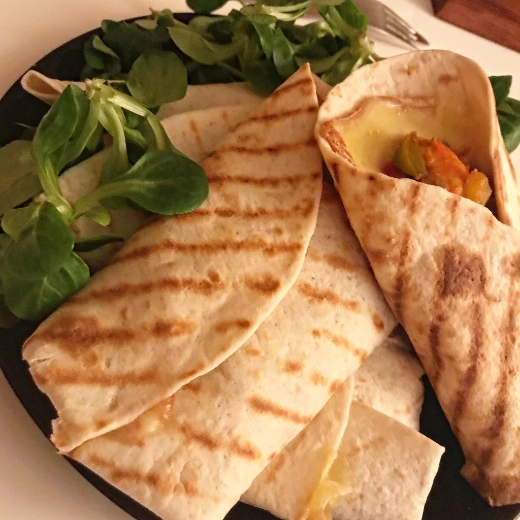 J’ai fini par ajouter les crevettes en fin de cuisson. J’ai pris chaque galette dans lequel j’ai positionné des morceaux de fromage, qlq secondes au micro-ondes pour que le fromage fonde plus vite, puis j’ai terminé dans une poêle à grill pour avoir la couleur, j’ai disposé deux cuillères de la préparation de crevettes et j’ai refermé le tacos 🌮