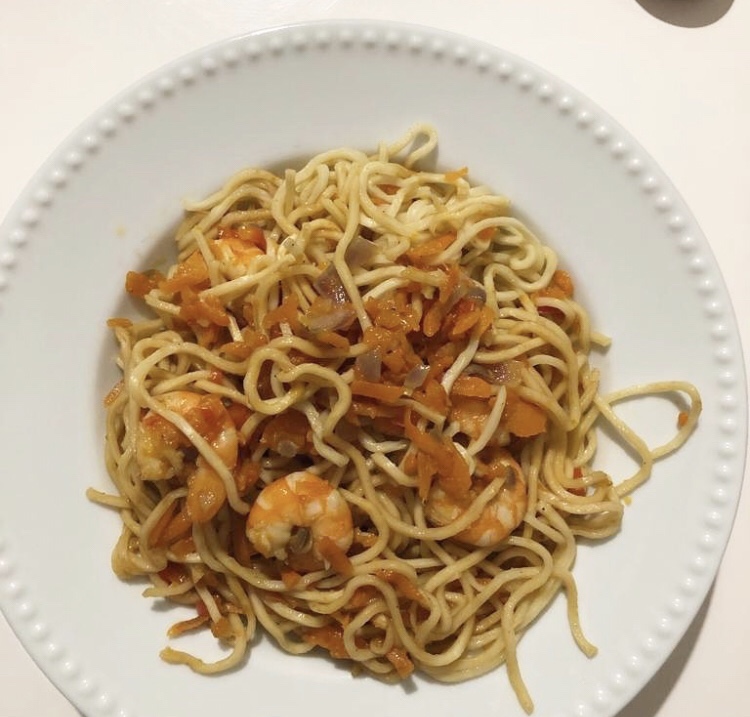 Pour ces Nouilles sautées à la japonaise j’ai mis des crevettes, 🥕 , 🧅, 🧄 , 🫑 rouge, gingembre, piment d’espelette, 🧂 poivre et un mélange de sauce soja avec du ketchup 😍🇯🇵
