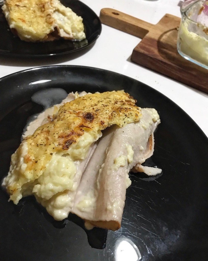 J’ai terminé par le montage ; enrouler chaque endive d’une tranche de poulet, étaler votre béchamel puis parsemer d’emmental râpé. Sel, poivre et herbes de Provence.