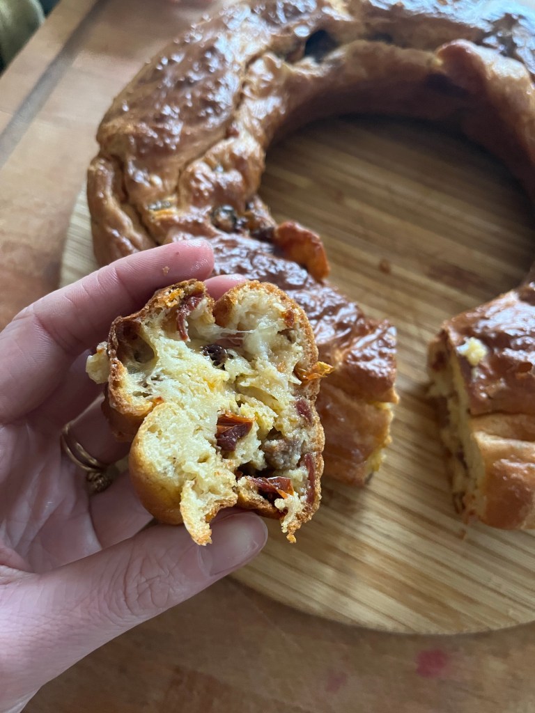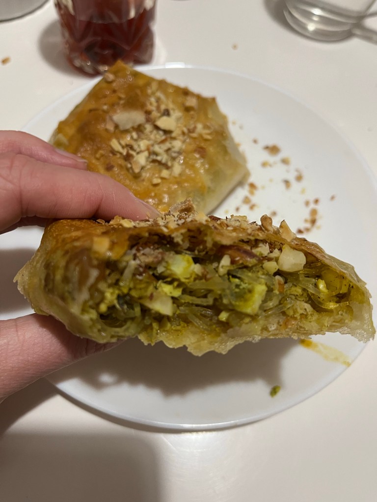 2 oignons, 1 ail, 1/2 reste d’un poulet cuit au four, 1/2 sachet de vermicelles de riz, 1 pincée de safran, 1 cac de curcuma, de cannelle, de gingembre, sel / poivre, 1 œuf dur, 1 poignée d’amandes broyées, 8 feuilles de brick, 1 œuf pour la dorure, du beurre/lait pour refermer les pastillas.