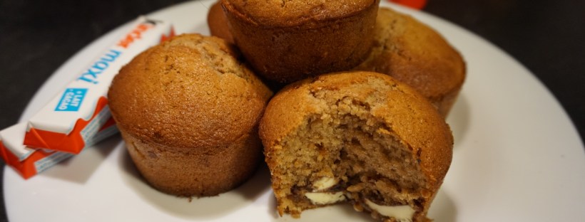 Versez le tout dans des moules en silicone (spécial muffins). Les remplir avec la pâte à seulement 1/3 et y déposer ensuite 4 carrés de kinder, puis les recouvrir à 3/4 seulement de pâte (ils vont gonfler à la cuisson).