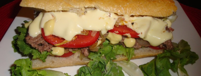 Ouvrez le pain en deux et y déposer 1 tranche de fromage divisée en deux. Disposez-le 2 minutes au four. Pendant ce temps faites revenir la moitié de l’oignon émincé, salez et poivrez. Sortez le pain du four et déposez sur le fromage les cornichons coupés en deux dans la longueur, puis un peu de tomates. Ajoutez ensuite les morceaux de steak avec le reste de tomate, et de la salade. Enfin, disposez la dernière tranche de fromage légèrement préchauffée, avec un tout petit peu de mayonnaise 🙂