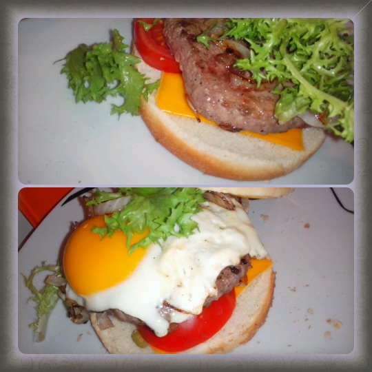 Pour les gros gourmands, il faut un steak, un œuf, des oignons, une tomate, des cornichons, de la salade, et du fromage à hamburger.