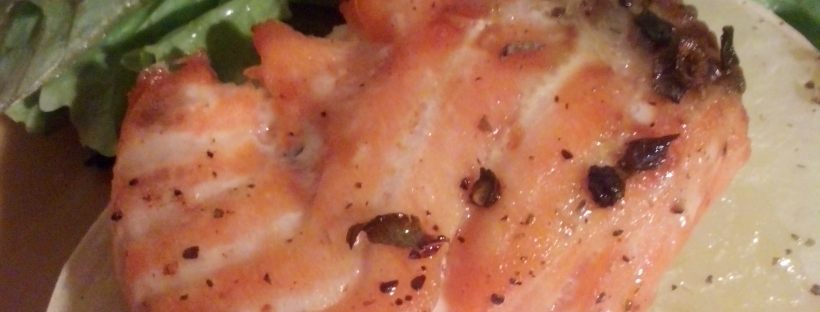 Ce que j’avais dans mes placards : des pommes de terre, du saumon, du chèvre, du poivre, de la ciboulette, de l’origan et un filet d’huile.