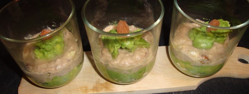 Dans vos verrines, déversez grâce à une poche à douille la crème d’avocats (gardez-en un peu pour la décoration). Petite astuce: si comme moi, vous n’avez pas de poche à douille, prenez simplement un sachet de congélation dont vous coupez un angle 🙂