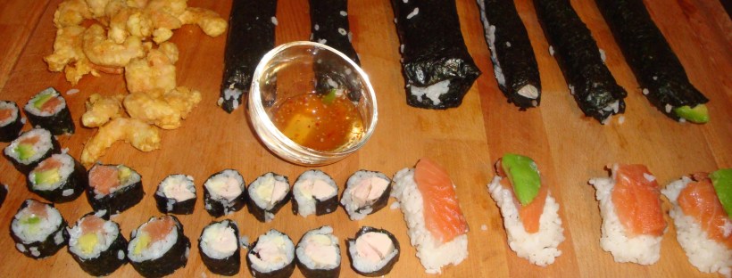 Ensuite, étalez le riz refroidi sur l’algue (une petite couche fine), ajoutez selon vos goûts votre garniture (poulet/harissa/fromage et/ou saumon/avocat/petit suisse). Enroulez le tout, puis coupez des rondelles de makis (environ 8 par algue).