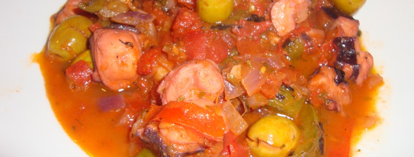 Pendant ce temps dans une casserole faites bouillir l’eau avec un peu de sel et y plonger les rondelles de poulpe pendant 10 minutes. Puis les ajouter à la piperade avec un peu d’eau et les feuilles de laurier. Laissez mijoter à peu près 15/20 minutes.