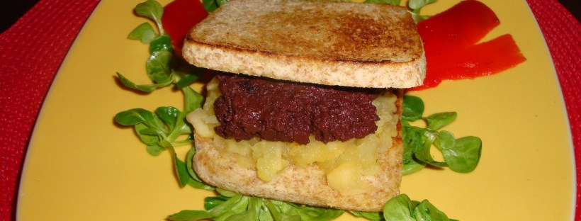Dans une assiette, étalez la compote sur 1 tranche, puis la chair du boudin noir, et refermez le tout avec la deuxième tranche.