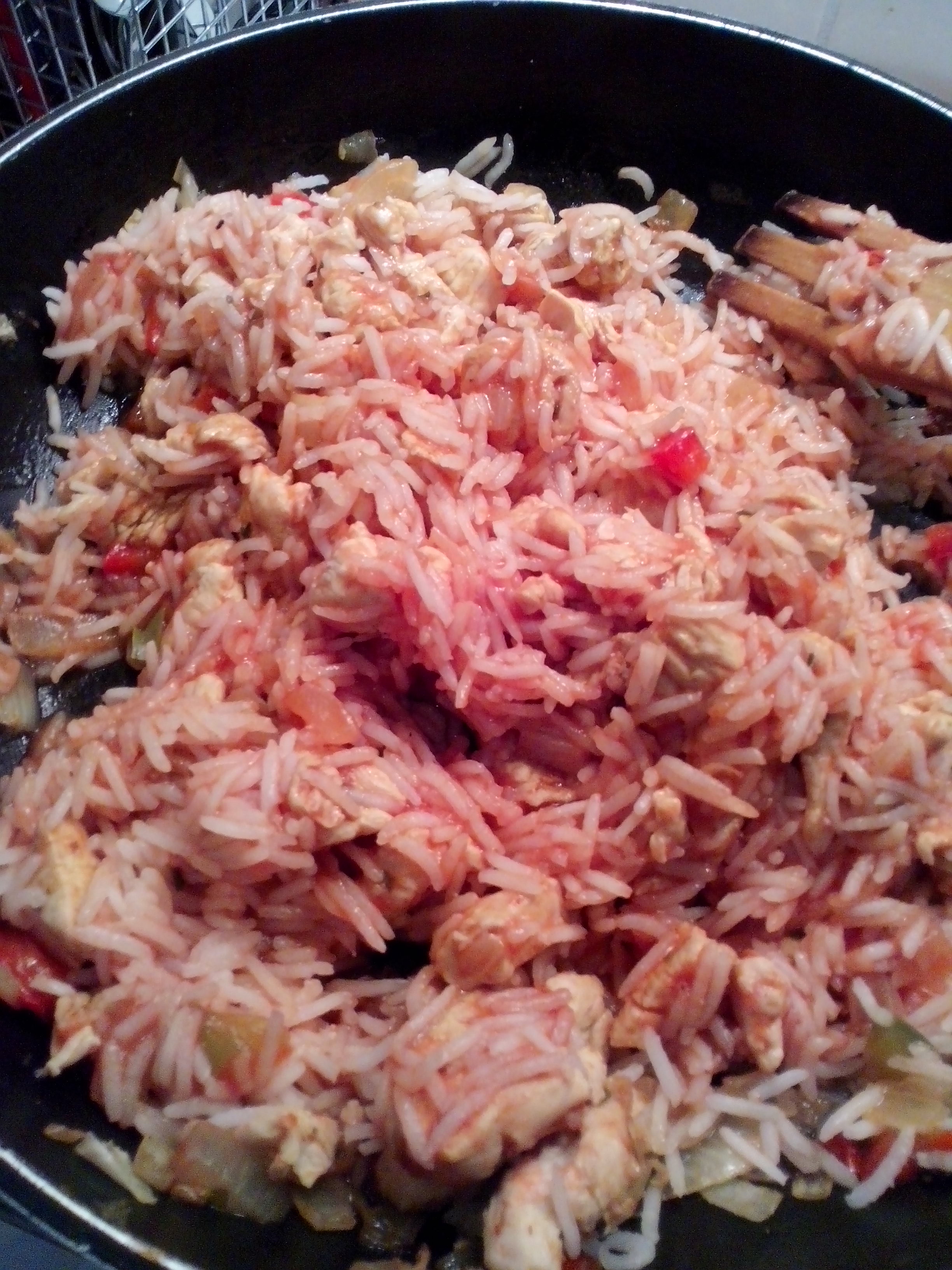 Une fois la préparation cuite, y verser les crevettes puis le riz.