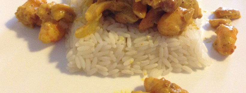 Pendant ce temps, faites revenir les oignons dans une casserole avec le gingembre et le curry. Y ajouter la petite briquette de lait de coco et versez 3 verres d’eau (avec le cube de bouillon). Faites bouillir.