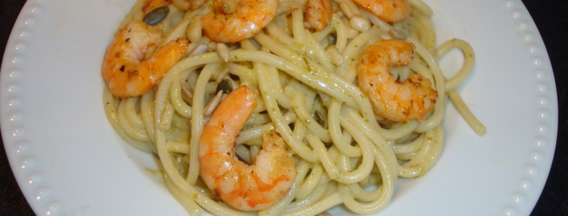 Mélangez la sauce avec les pâtes et servez-les dans les assiettes. Disposez les crevettes sur les pâtes et parsemez de pignons de pin.